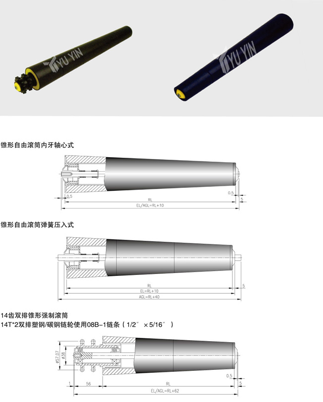 自由滾筒根據其外管材質、管材直徑、軸心直徑、軸心材質、壁厚以及尺寸計算方式等制作而成,一般分為兩種類型,一種是用黃色的PP材料制作成的端蓋的無動力內牙軸心式的輸送機自由滾筒,還有一種則是以金屬作為材料制作而成的端蓋的無動力內牙軸心式的輸送機自由滾筒。